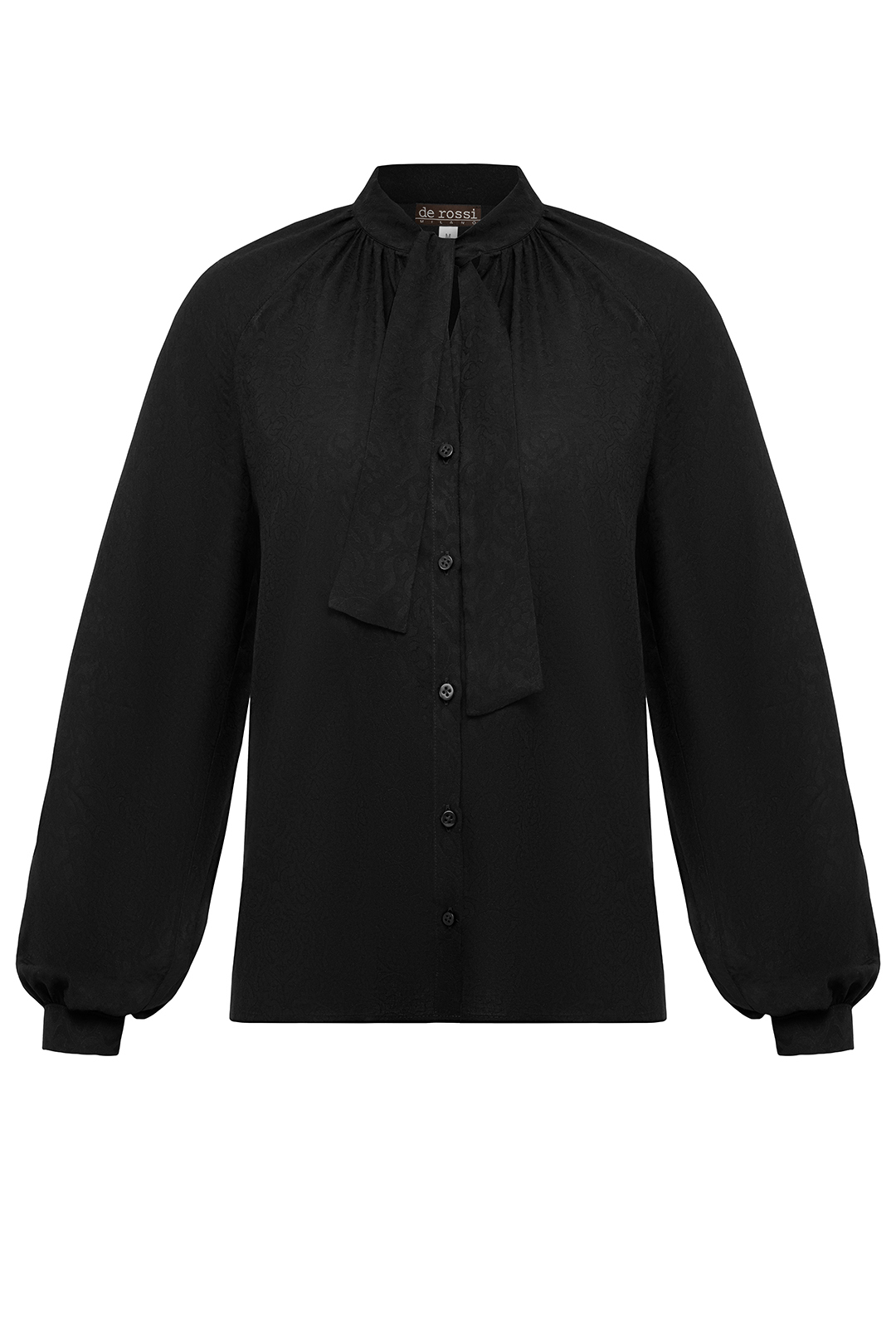 Элегантная блузка из струящейся как шёлк нежнейшей вискозы с богатой орнаментальной фактурой. Воротник можно завязывать бантом, либо распустить его как ленты. Пышный рукав красиво собран на манжет. Блузку можно носить как со строгим пиджаком, так и с джинсами. Чёрный делает её универсальным предметом женского гардероба.
