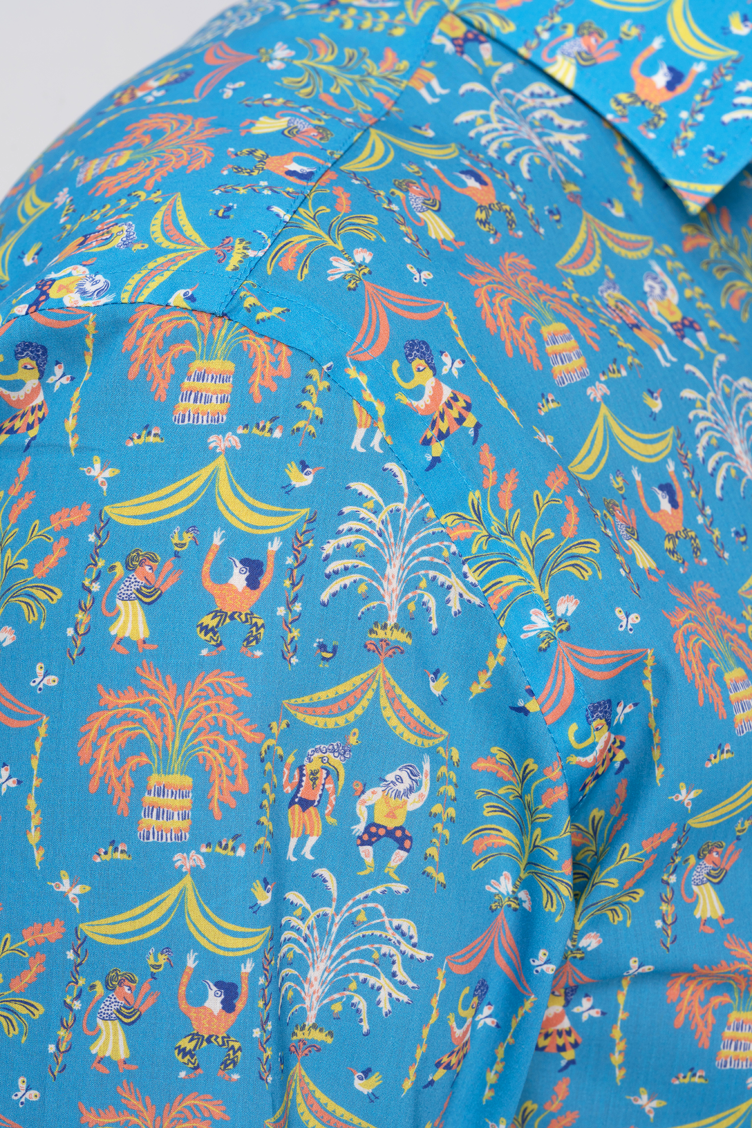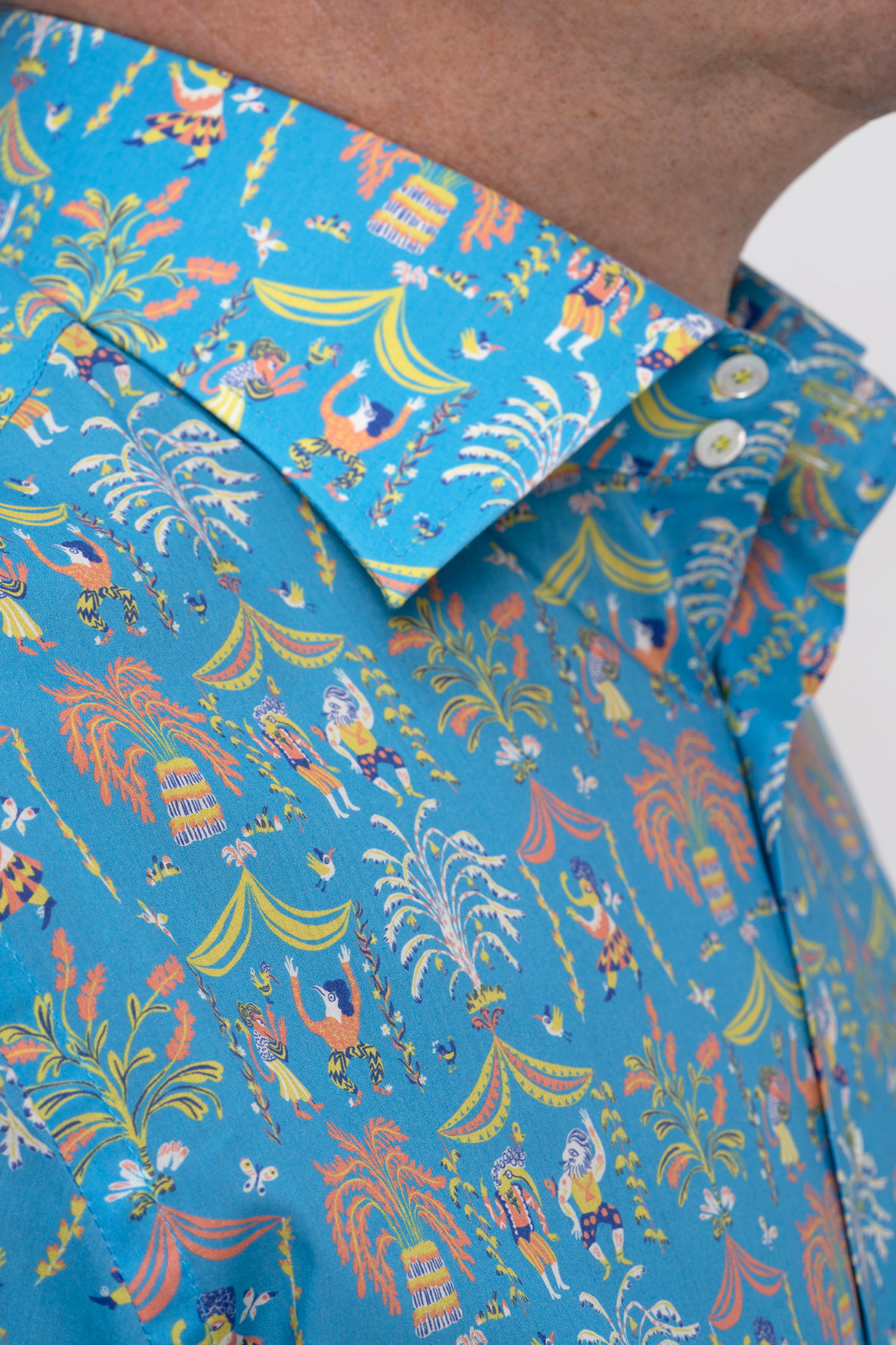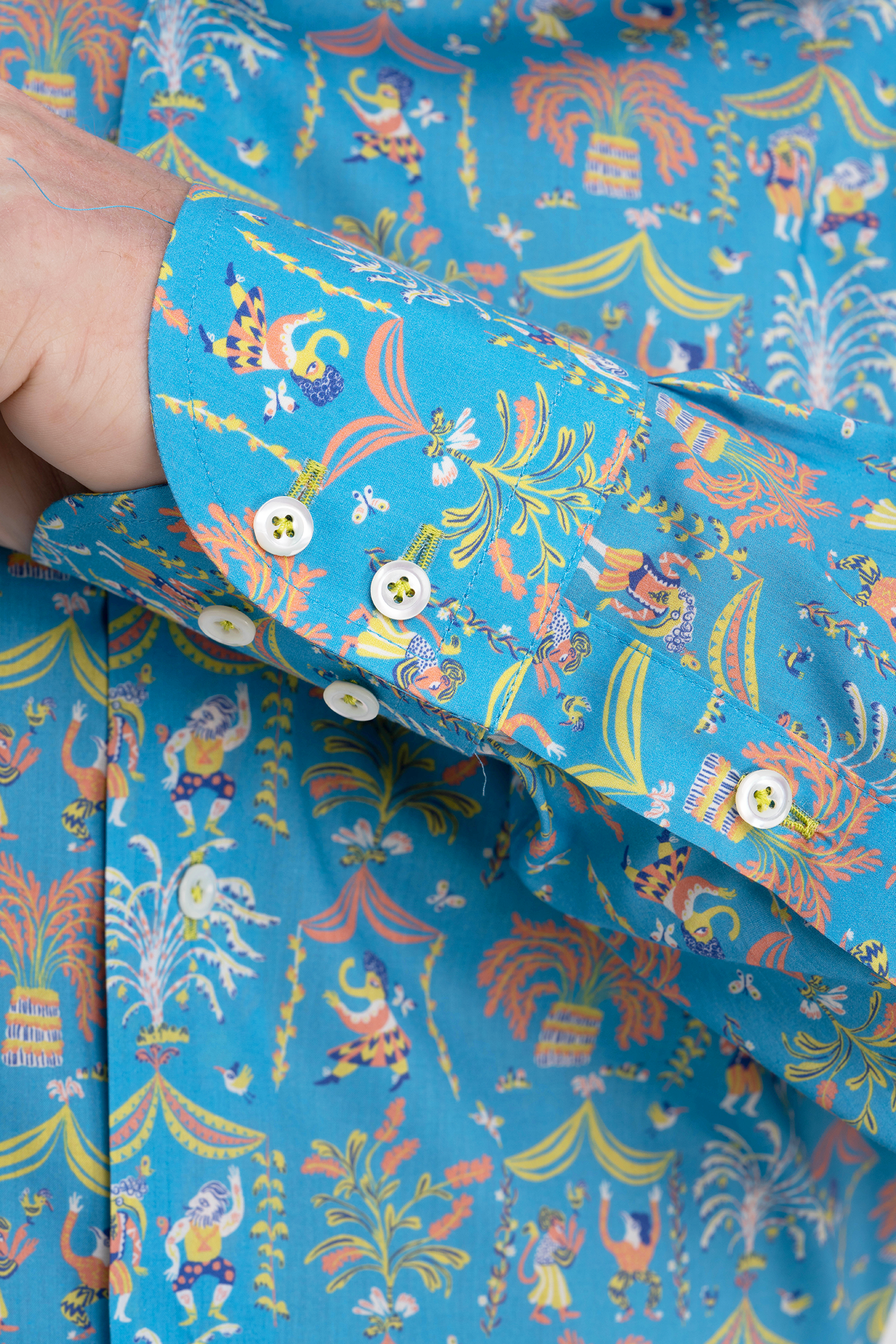 Рубашка сшита из особого хлопка Tana Lawn – его нити особенно прочные и гладкие, что создаёт тонкую, дышащую и прочную ткань, подобную шёлку. Гладкость нитей позволяет наносить яркие и тонко прорисованные принты, а краски никогда не потускнеют.
